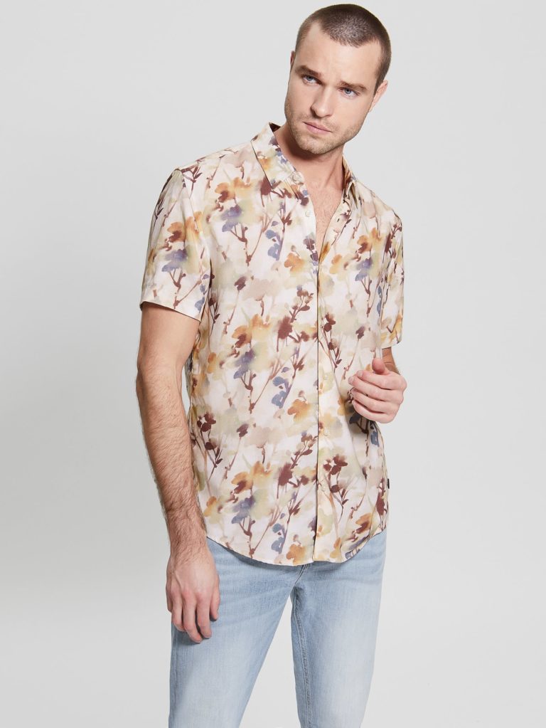 Nature-inspired, this button-down challis shirt features an allover desert poppy print, a folded collar and short sleeves. Contains responsibly sourced forest fiber.