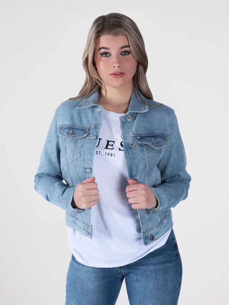 Complete your look in style this season with our Pacific Blue Doria Denim Jacket. Crafted from a soft stretch cotton blend material, this jacket features long sleeves, a folded collar, front pockets and front button closure, and GUESS logo detailing. Pair with a basic tee and jeans for a classic off-duty look.