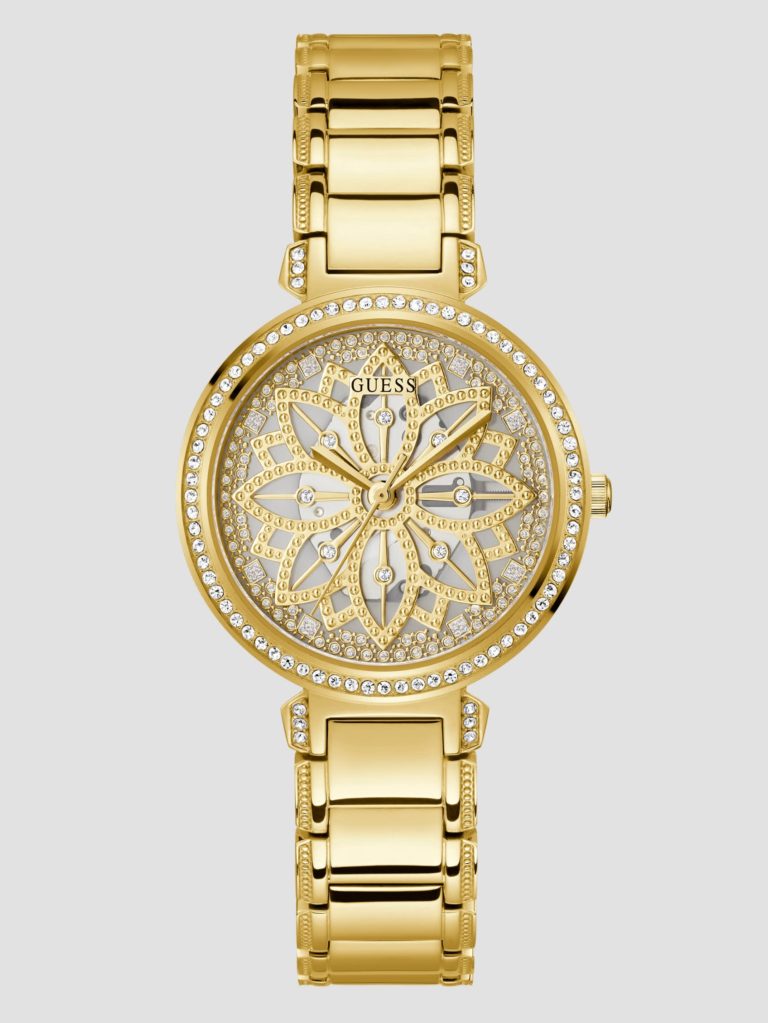 This flirty filigree inspired floral dial is see-thru to your wrist and features a full crystal bezel as well as crystal detailing on the connection to the bracelet