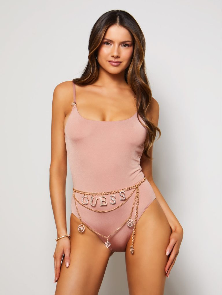 Slinky and classic, this one-piece swimsuit features an open back and embellished chain belt.