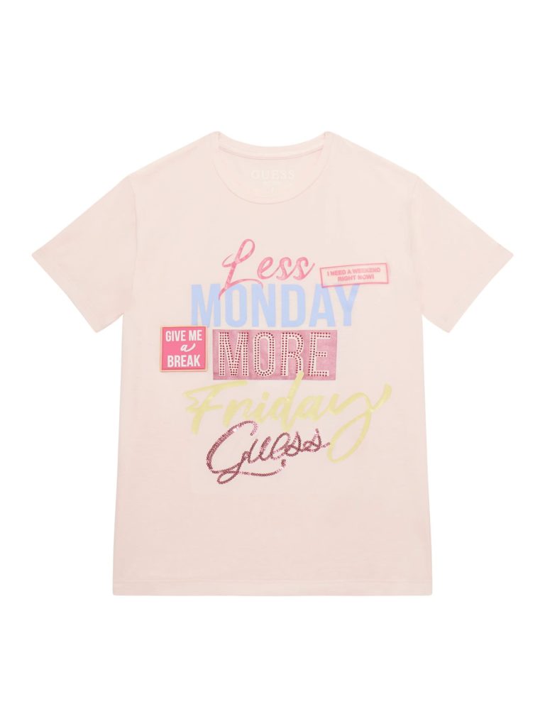 Made from soft viscose jersey, it features slogan print with embellished rhinestones, sequin logo and rubber patch on the front.