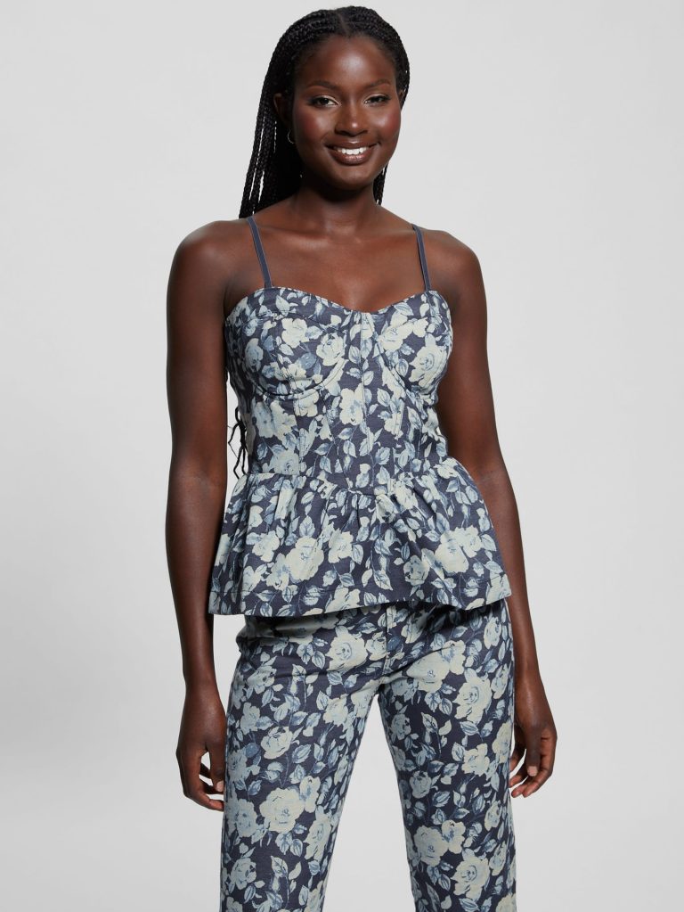 Jacquard-woven floral denim bustier top.