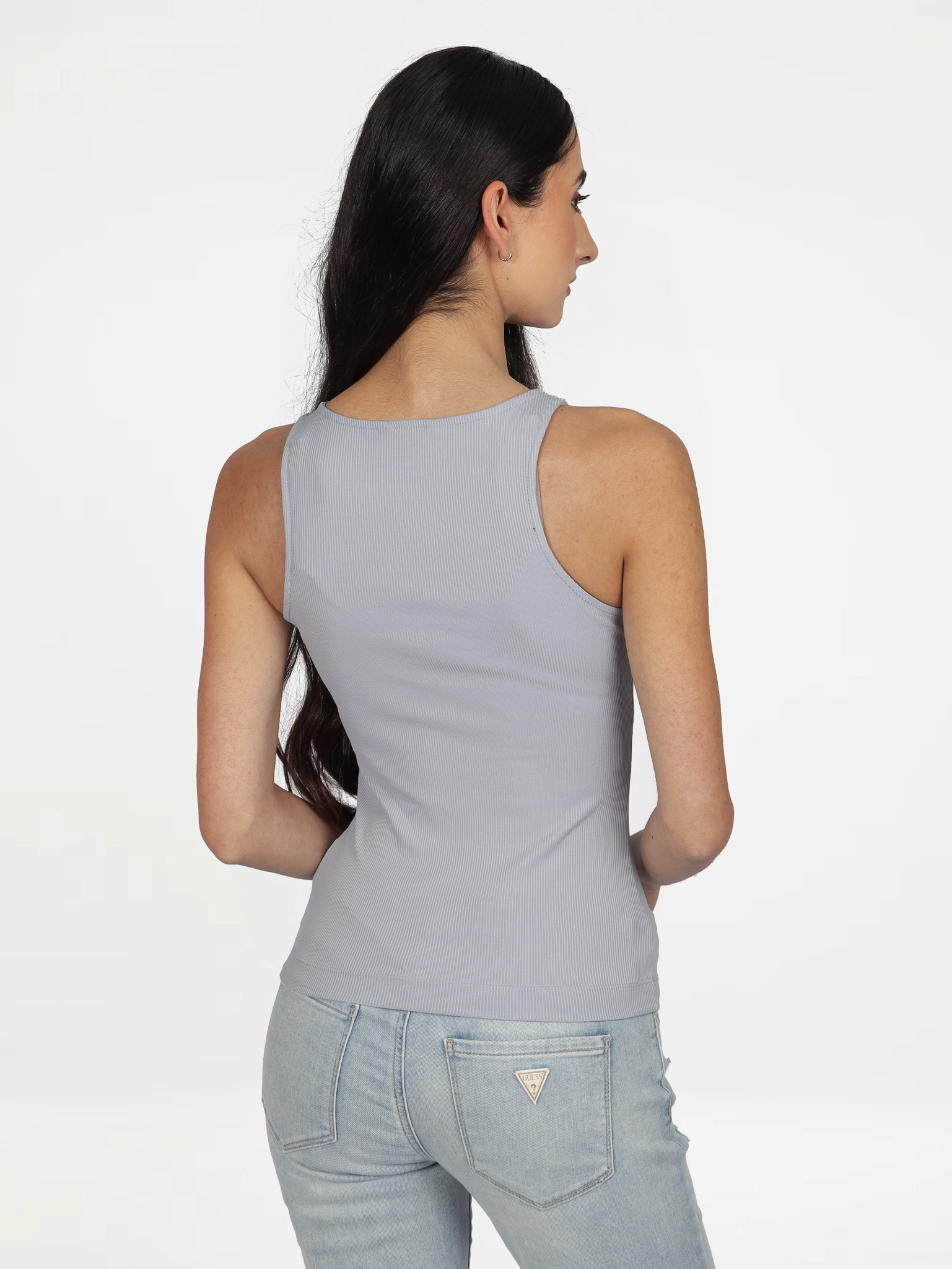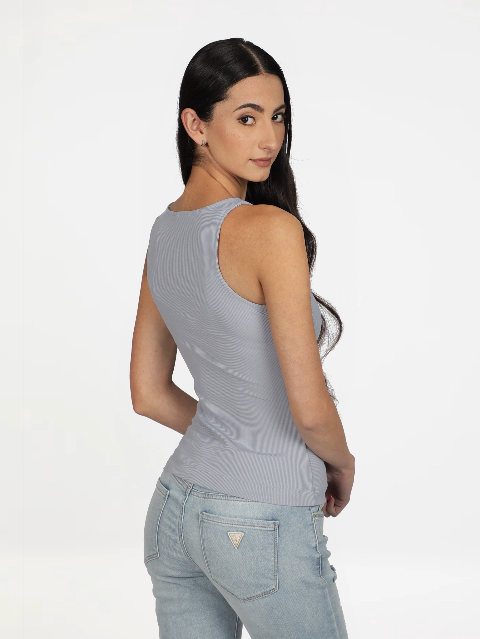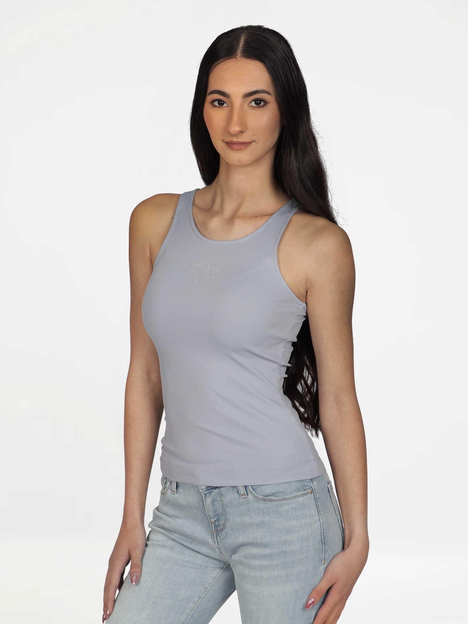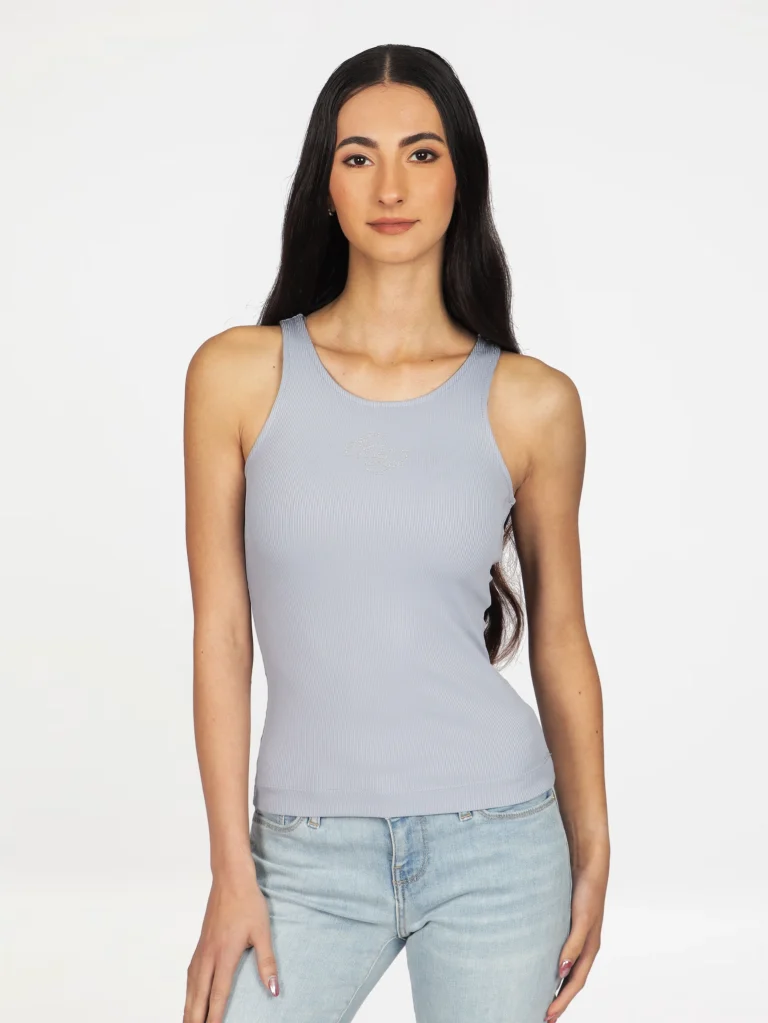 “Rib-knit tank top High neckline Front Quattro G Rhinestone signature logo Sleeveless Pull-on design”