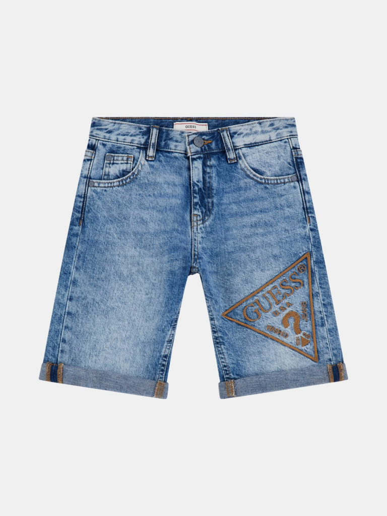Medium wash denim shorts.