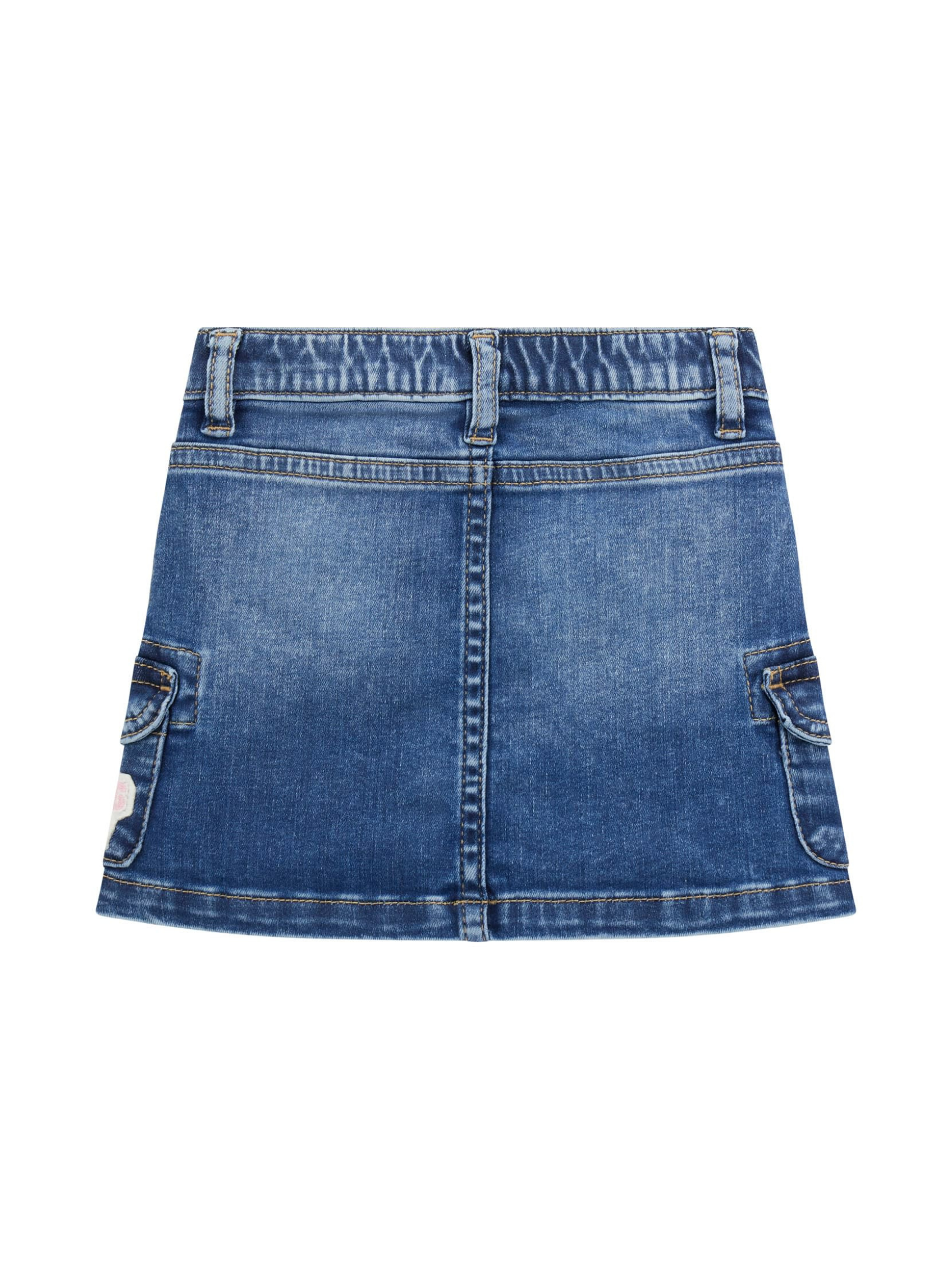 Add playful style to her denim rotation with this Stretch Denim Skirt (2-6). Featuring a classic five-pocket construction, this mini skirt stands out with side flap pockets and sweet embroidered patches for extra charm. Made with a soft stretch denim blend, it offers all-day comfort for her active lifestyle.