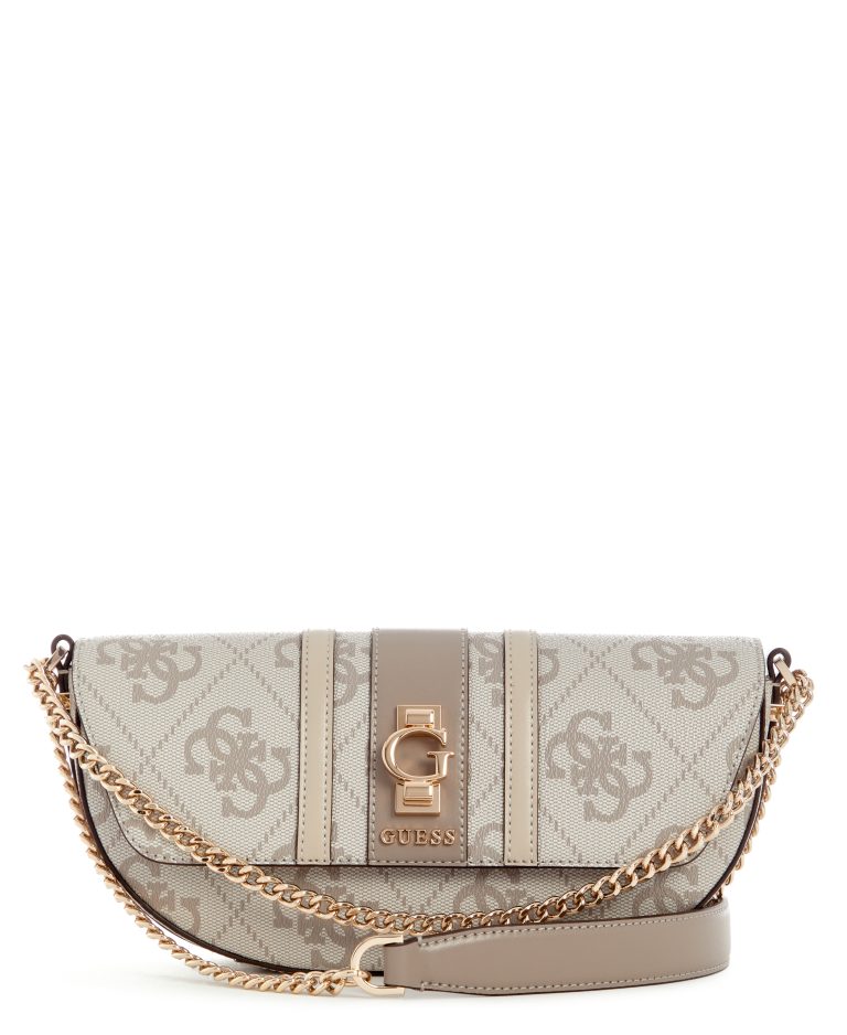 Make a statement with the Taupe Logo Erenia Convertible Crossbody Flap Bag. This sleek, rounded silhouette features the iconic all-over logo print, bold stripe detailing, and shiny gold hardware. Designed with a chain and leatherette strap and a secure magnetic flap closure, it easily transitions from shoulder bag to crossbody, perfect for day-to-night versatility.