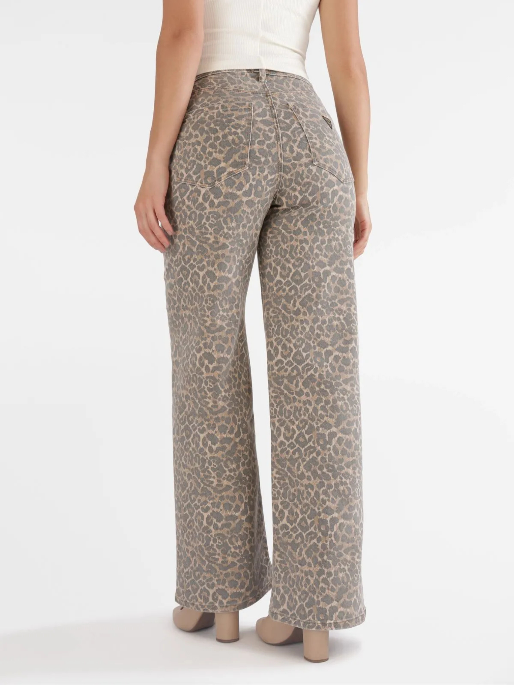 “Button and closure fastening Classic pockets Mom jean cut Guess logo application on the back Animal print design “