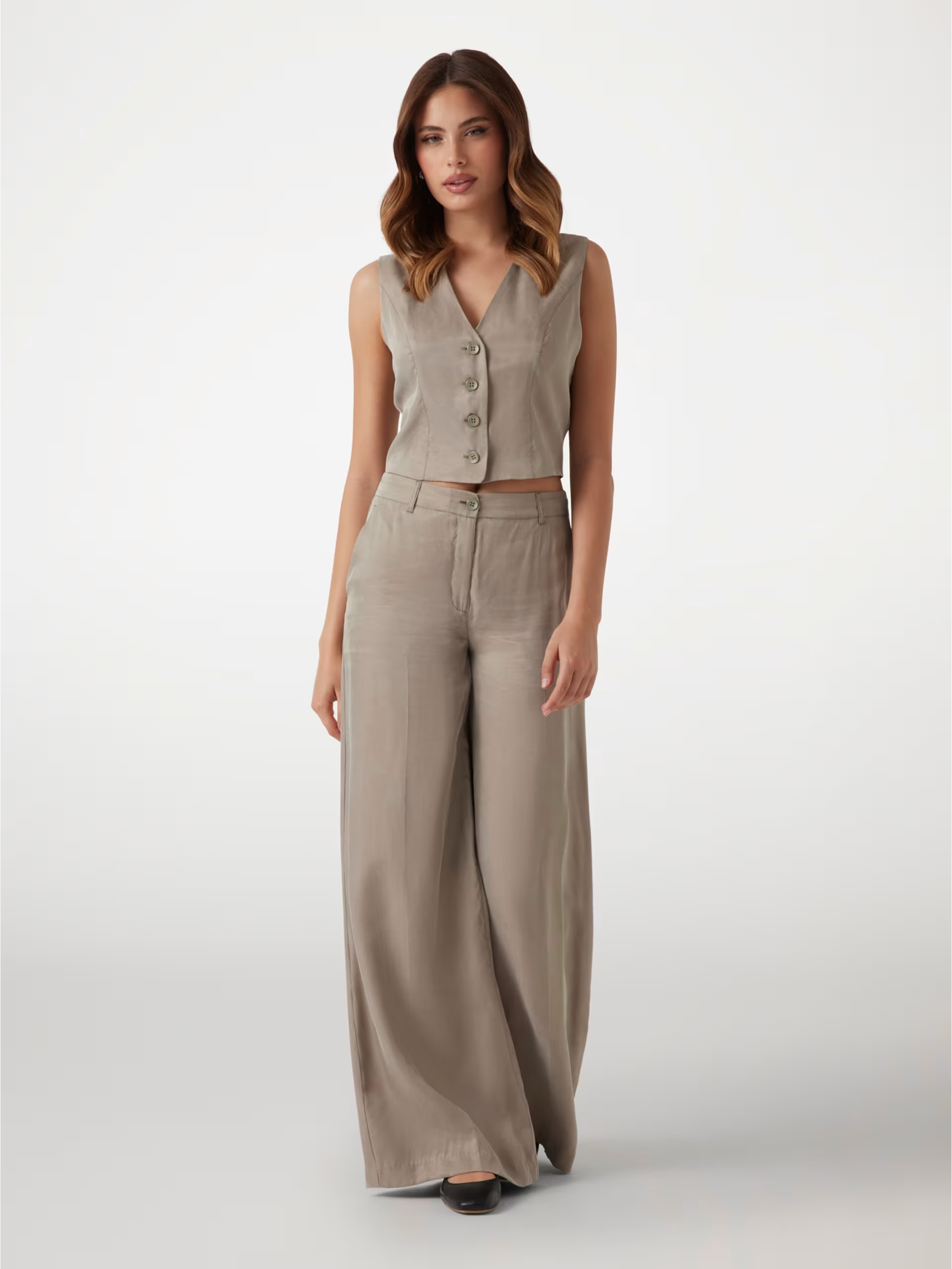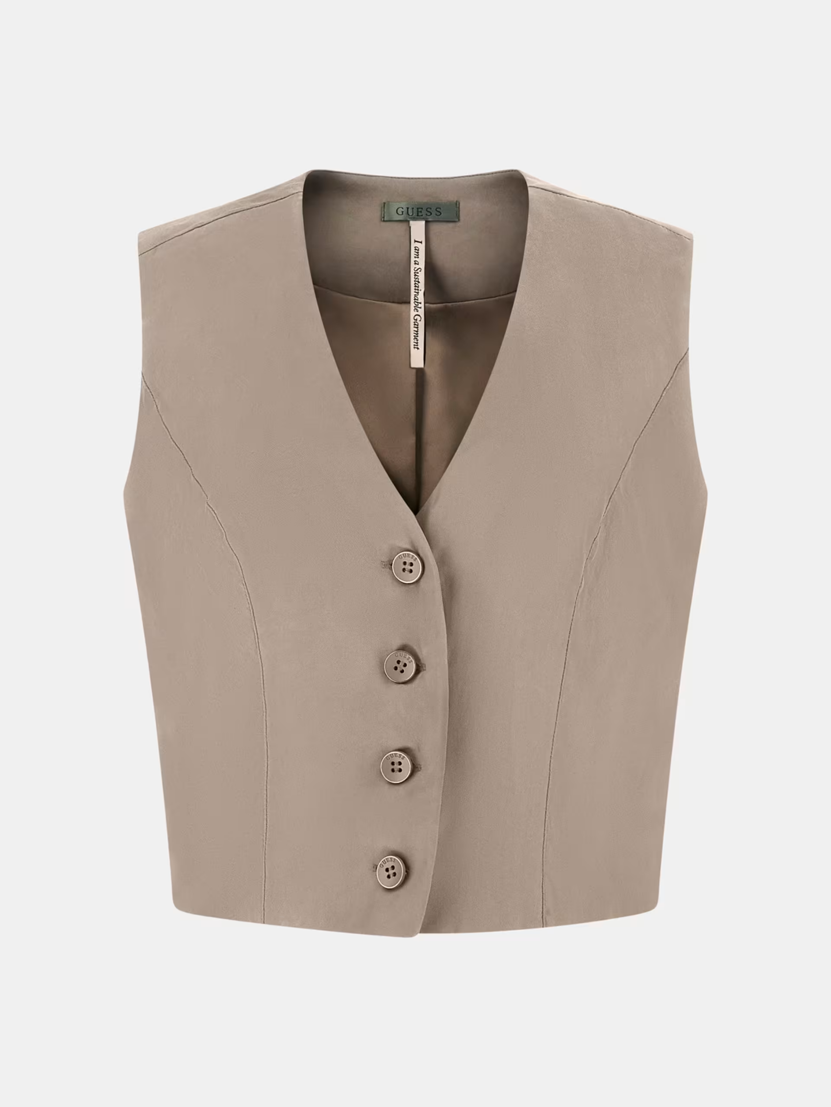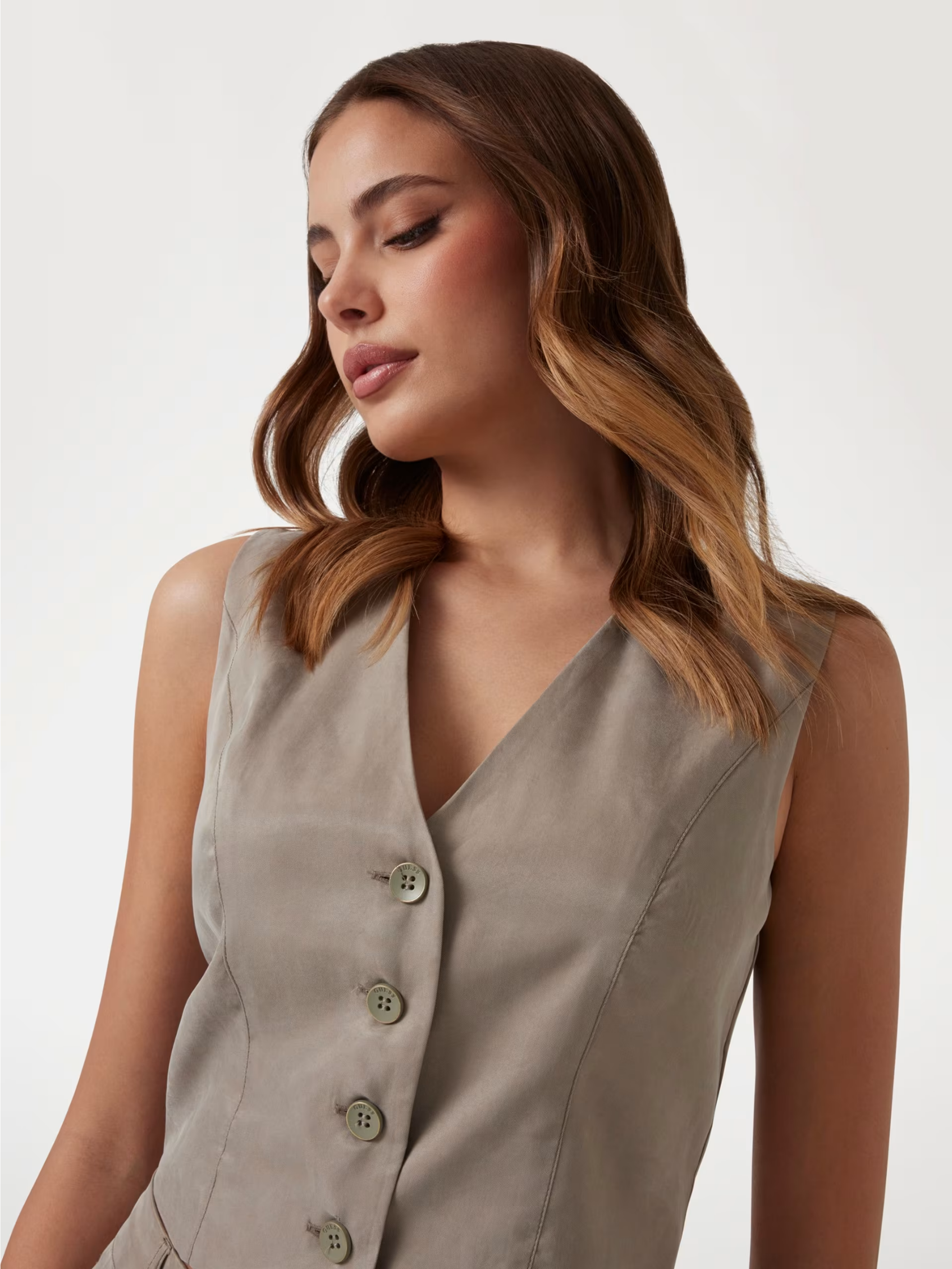 “Twill vest in viscose-lyocell blend. V-neck and sleeveless design. Fitted silhouette. Button fastening on the front.”