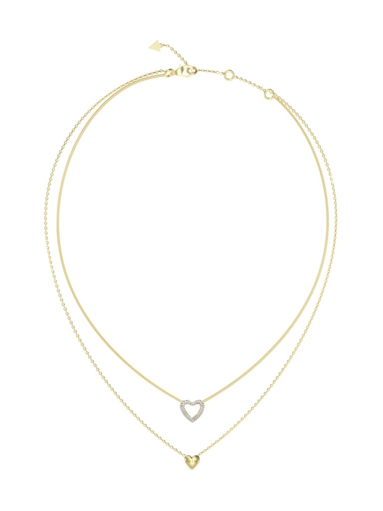 The GUESS “Beloved” Two Hearts Double Necklace is a sophisticated accessory that adds a romantic touch to any outfit. Crafted from gold-plated stainless steel, this necklace features a dual-chain design adorned with two intertwined heart charms, symbolizing love and connection. One heart is embellished with sparkling crystals, adding elegance to the piece. The necklace is secured with a lobster clasp and includes an extender for adjustable length.?