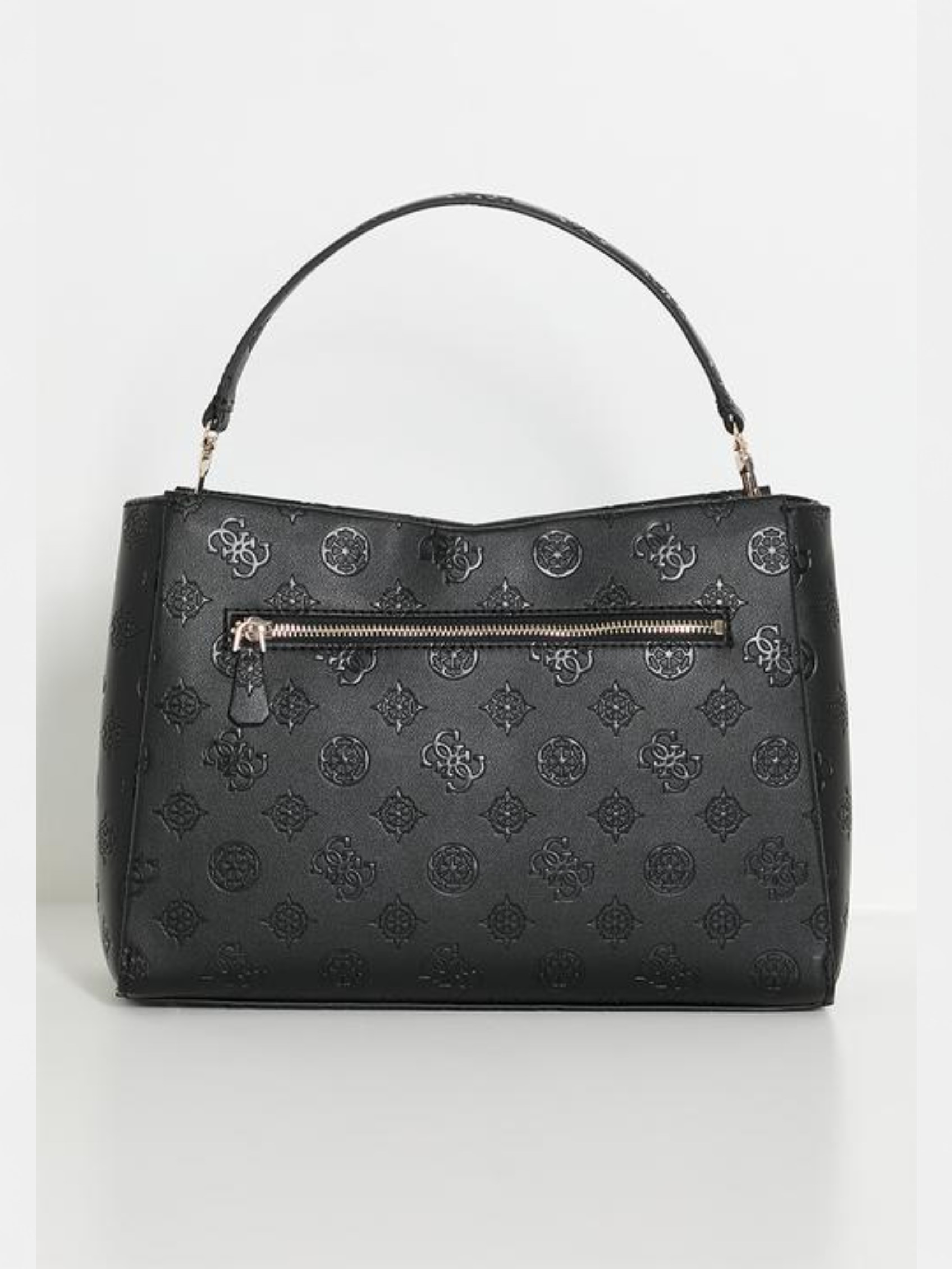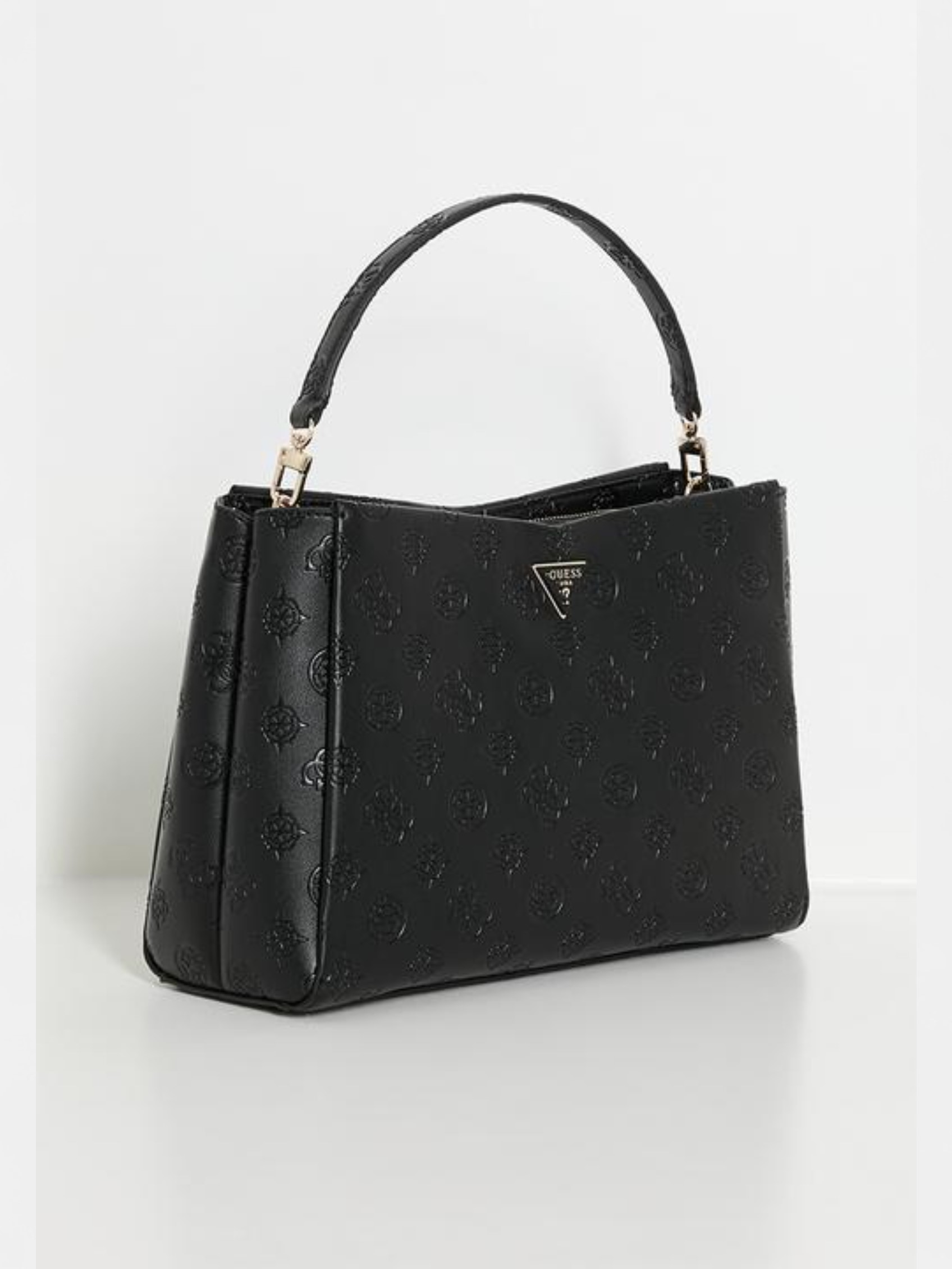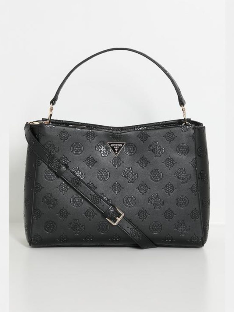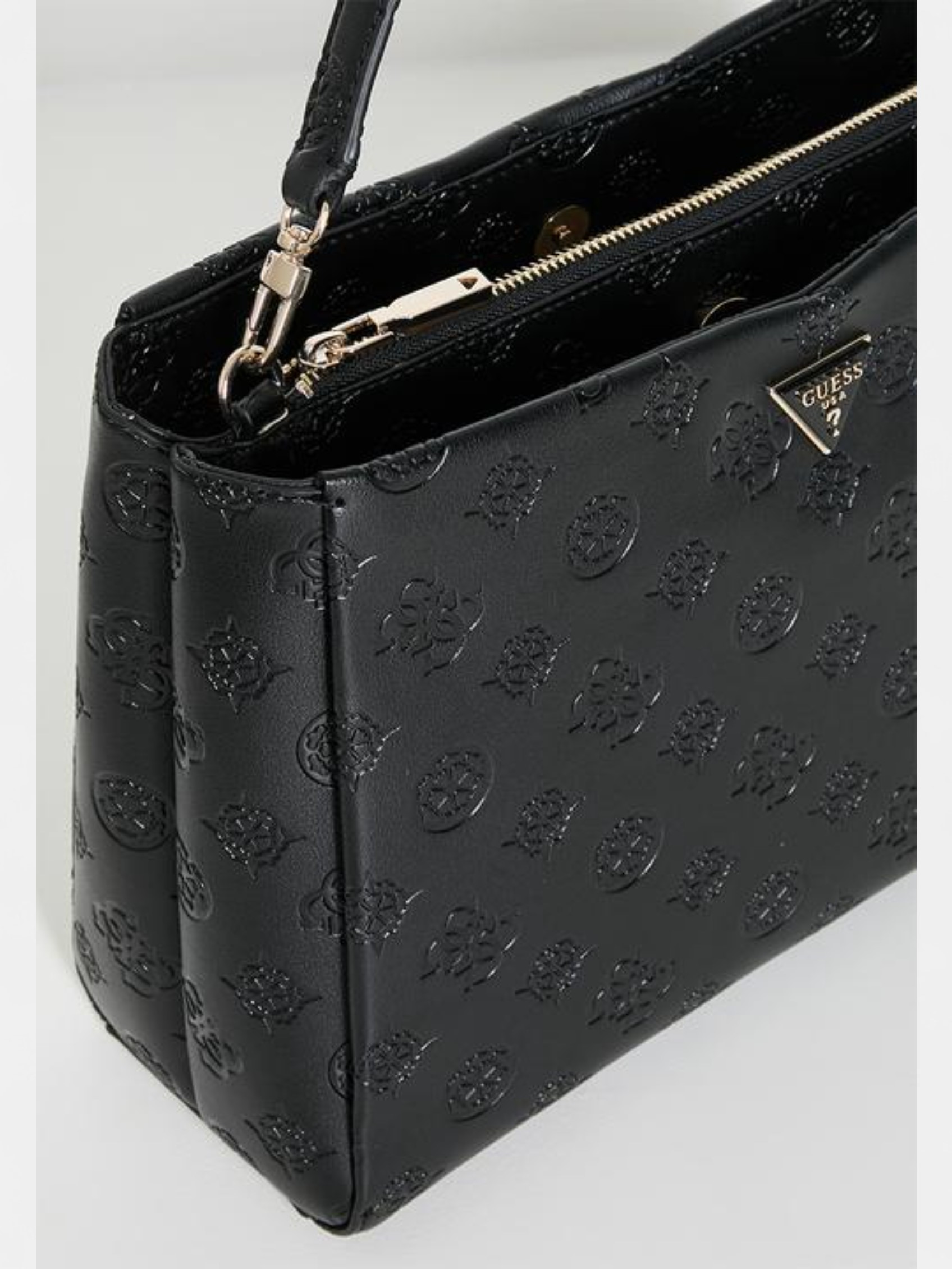Carry your essentials in style with the Black Logo Tisha Large Girlfriend Satchel Bag. Crafted from smooth PU with an embossed logo design, this structured satchel features dual top handles and a detachable crossbody strap for versatile wear. The spacious interior with secure zip closure provides ample room for daily necessities, while the subtle triangle logo plaque adds a refined GUESS touch.