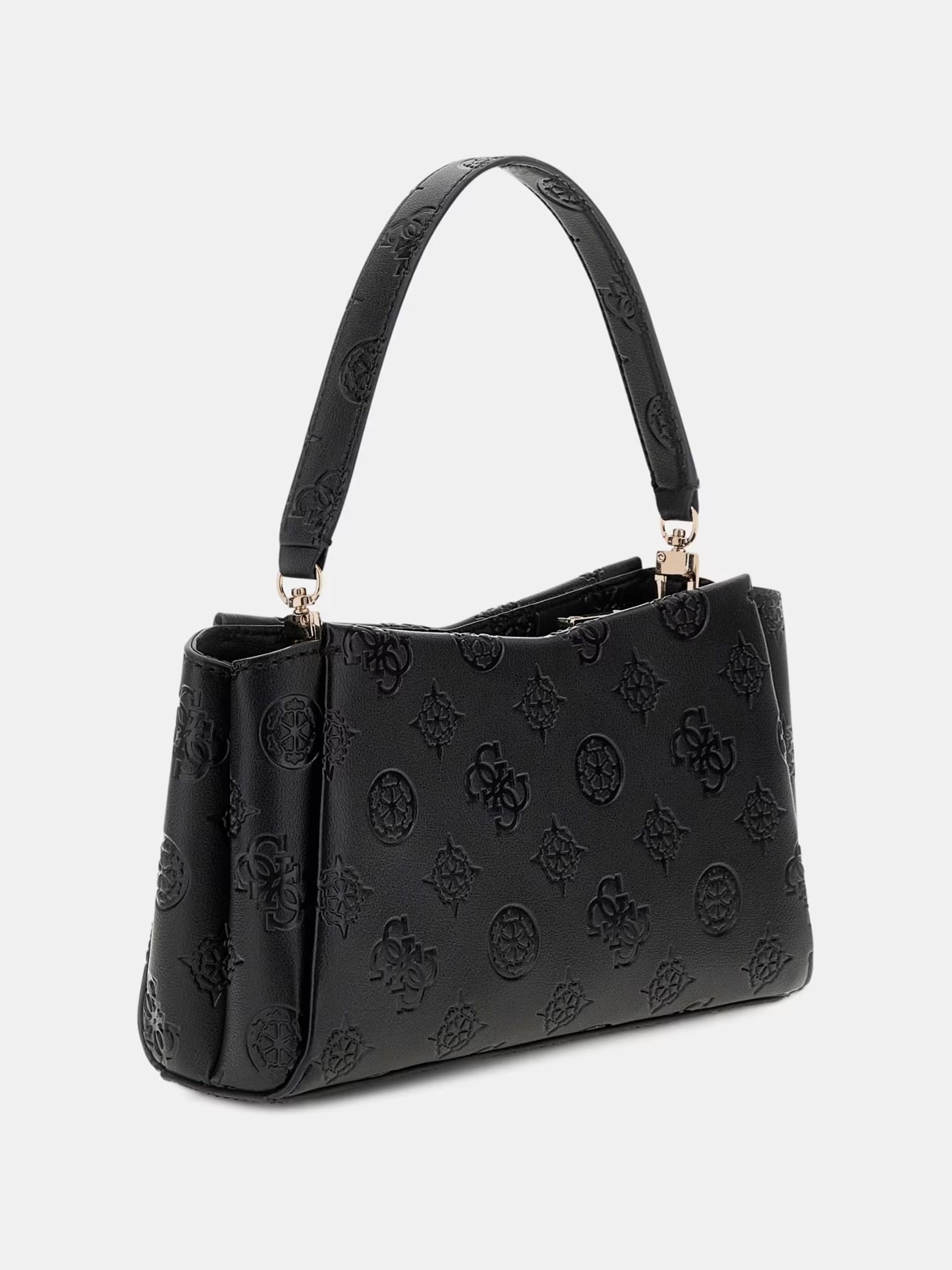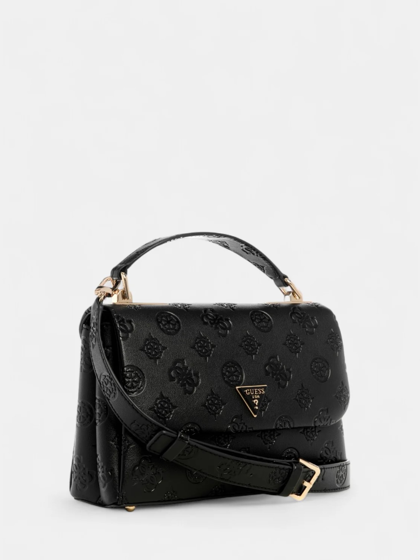Faux-leather crossbody bag Allover debossed Peony logo Shiny pale gold-tone hardware with front triangle logo Organized interior with lining Shoulder strap. Crossbody strap.