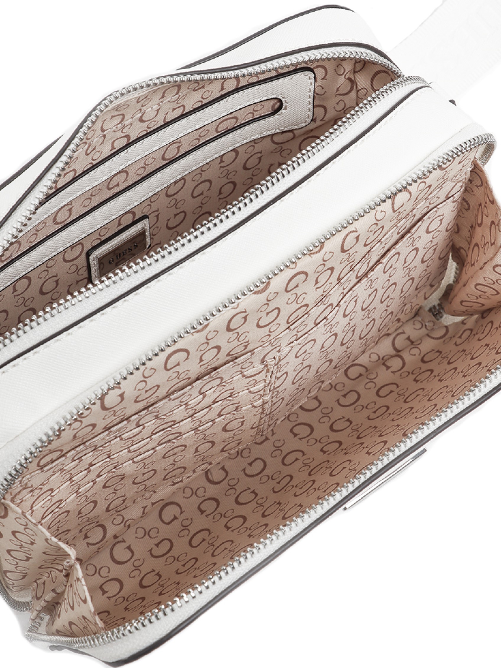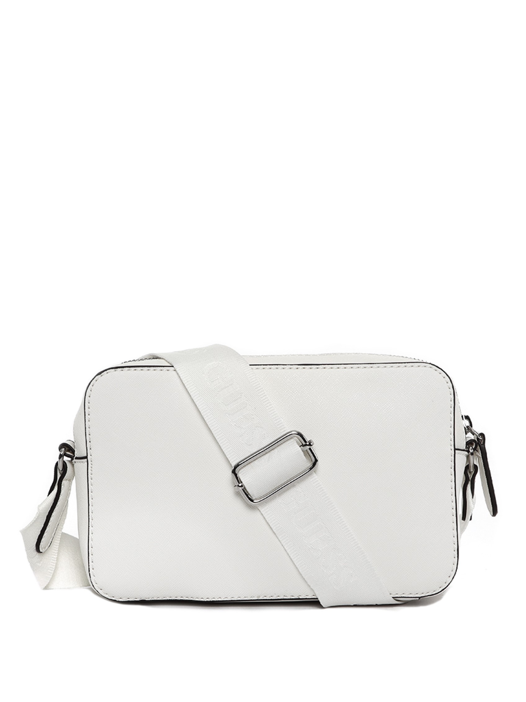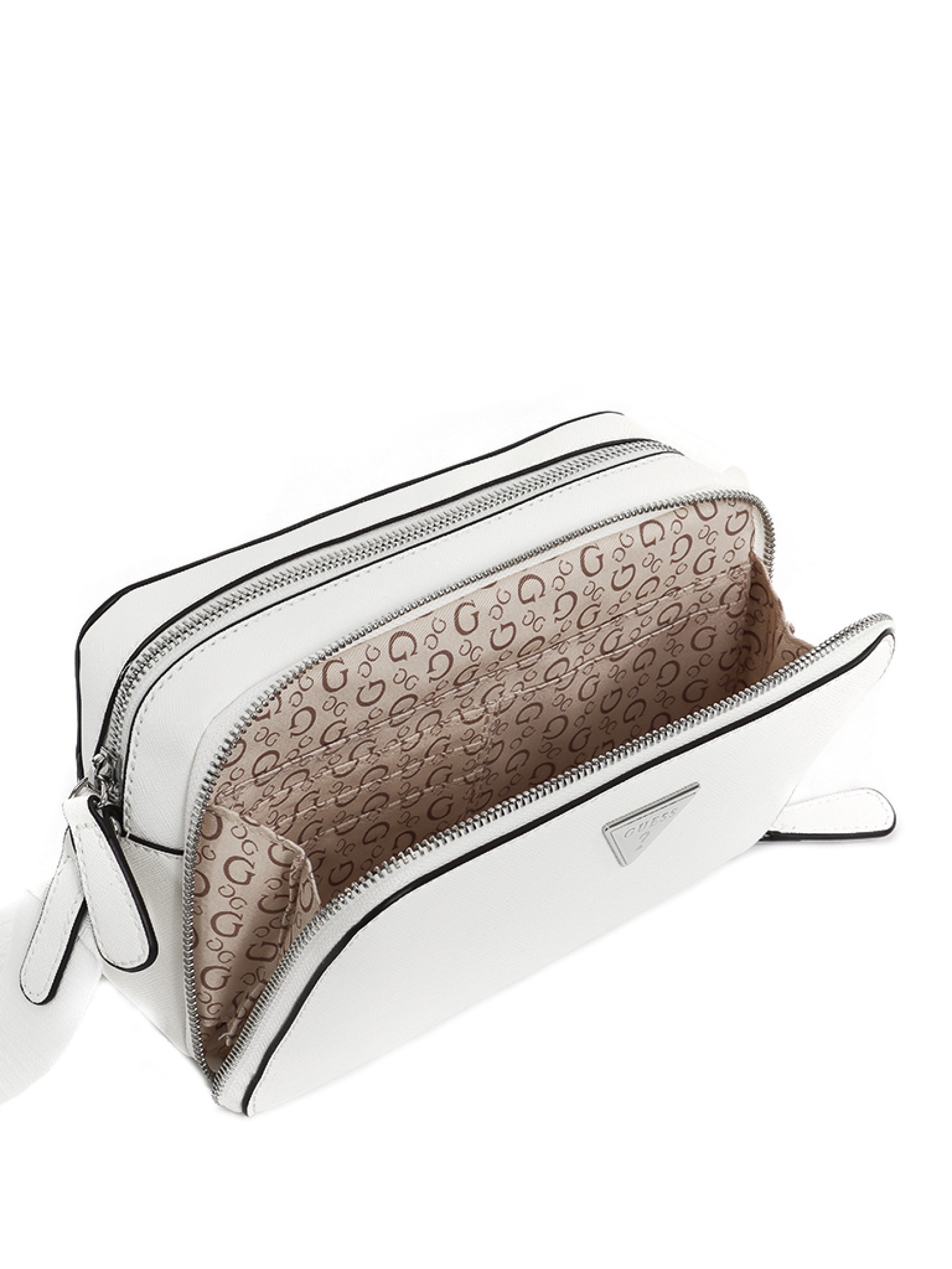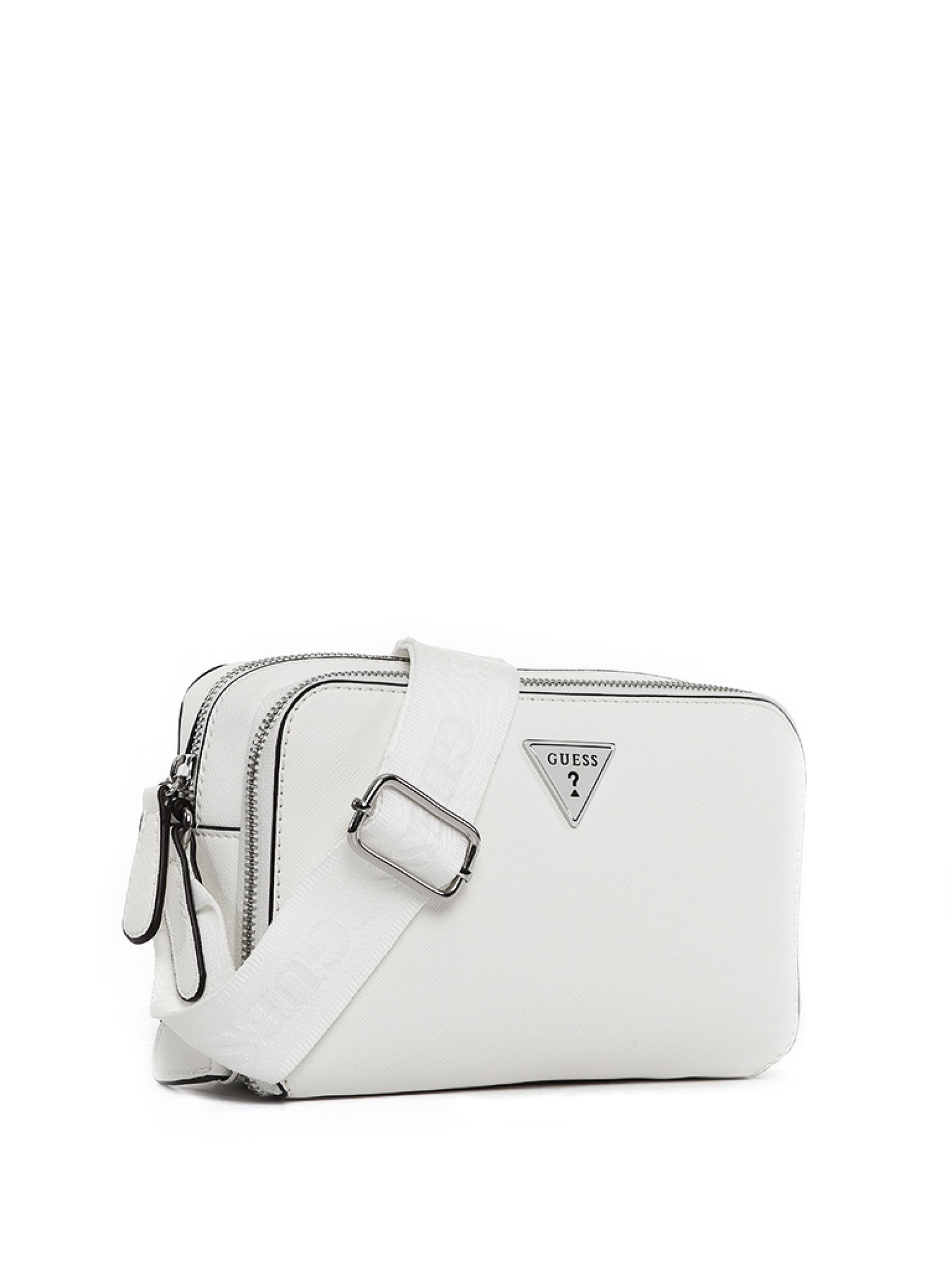 This elegant crossbody bag is perfect for everyday use, nights out, lunchtimes, and more. It features a main opening and a zippered compartment on the front, making it compact yet easy to use. The timeless triangle logo, characteristic of GUESS, adds a cool touch.