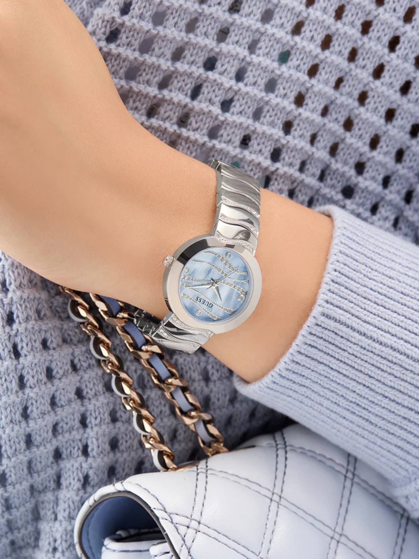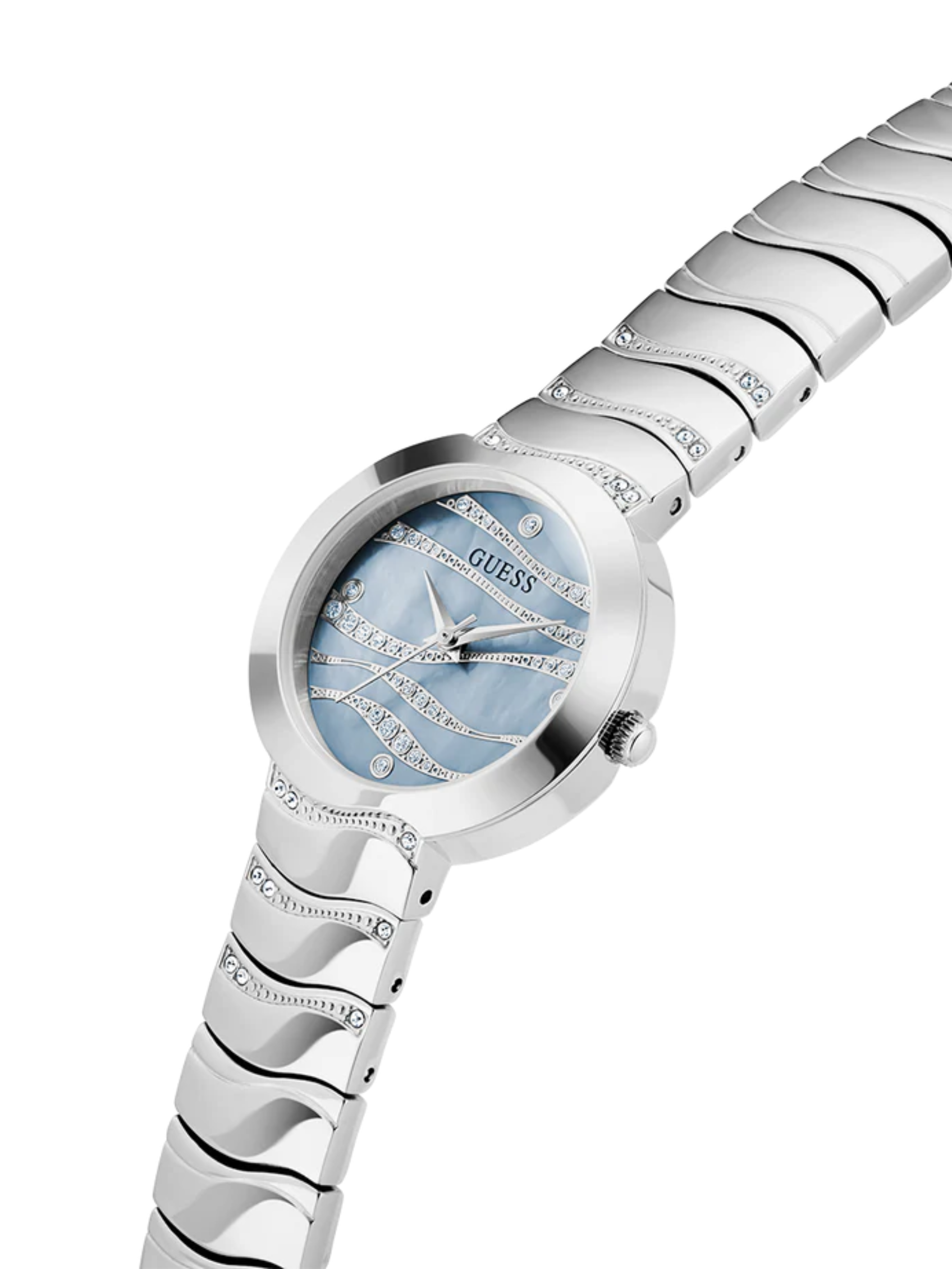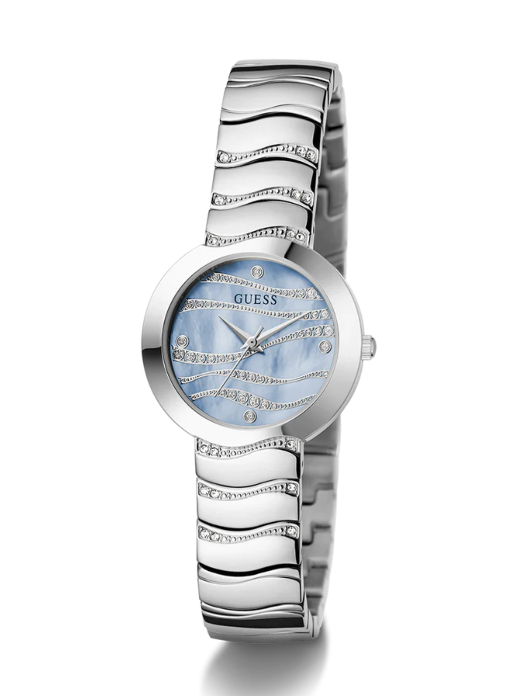 The perfect timepiece to make you feel like you’re on island time! This pretty new style features wave-like details on its bracelet and dial with MOP and glitz detailing.
