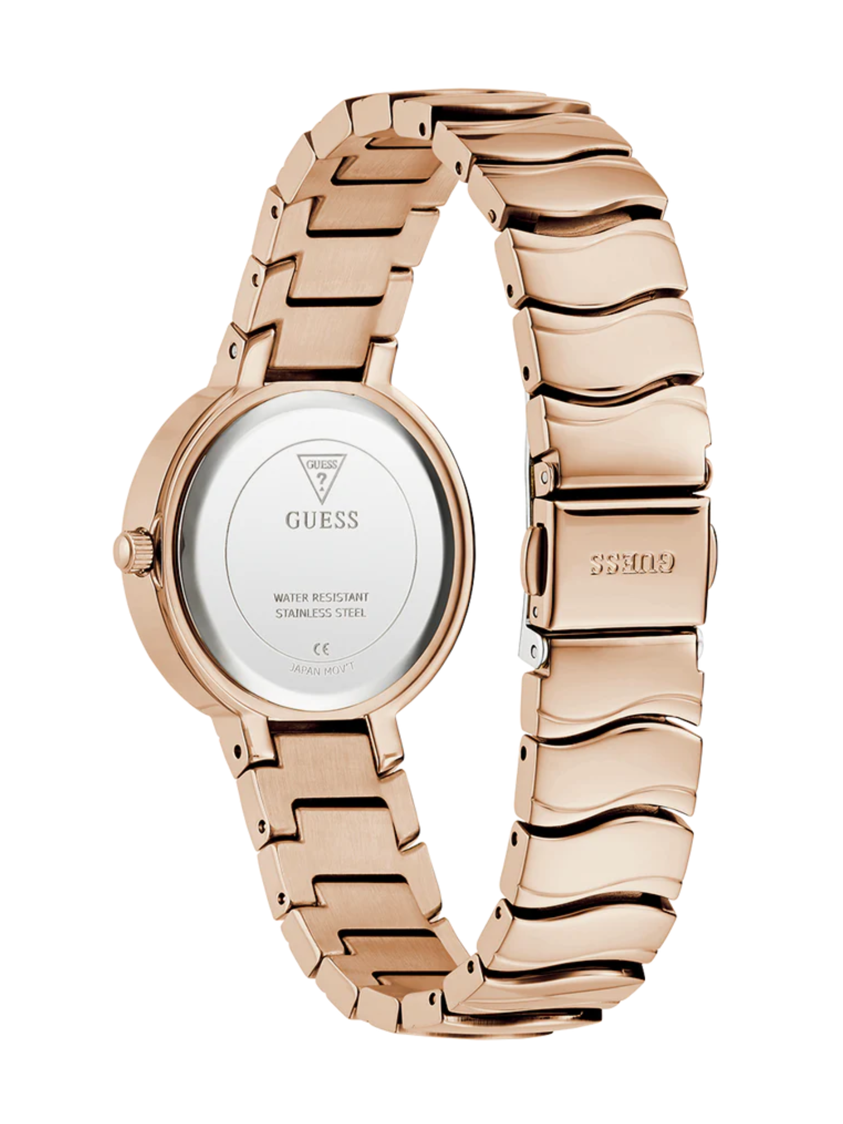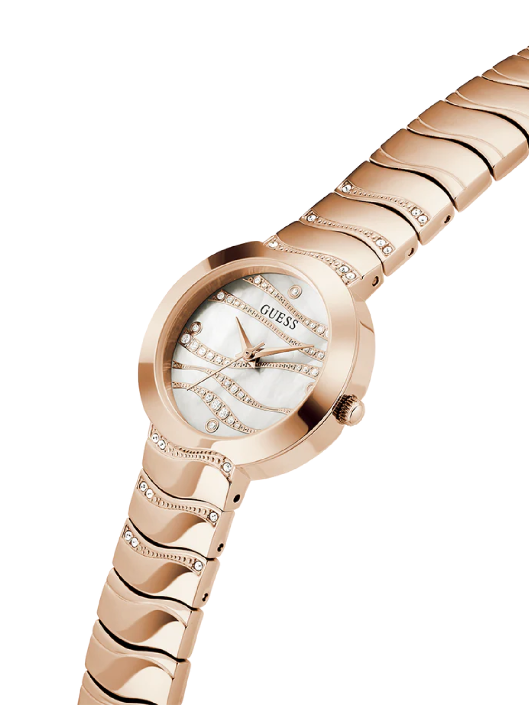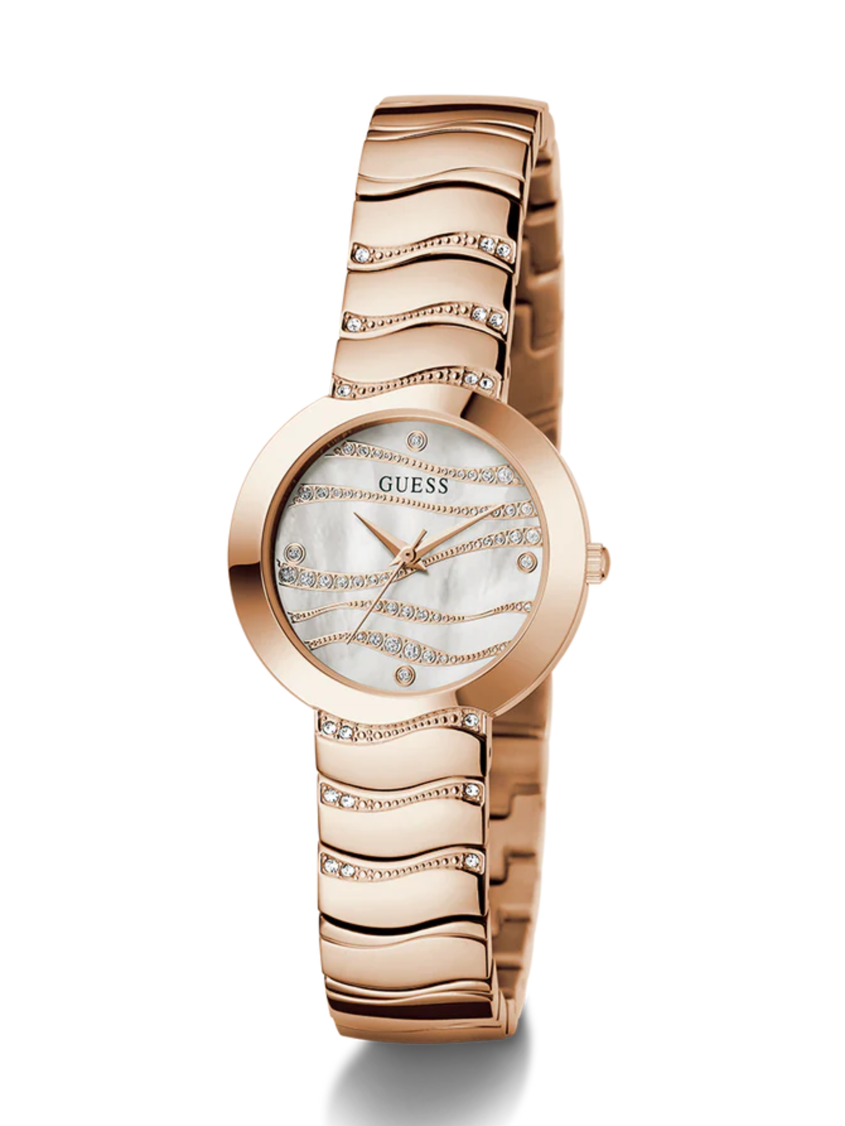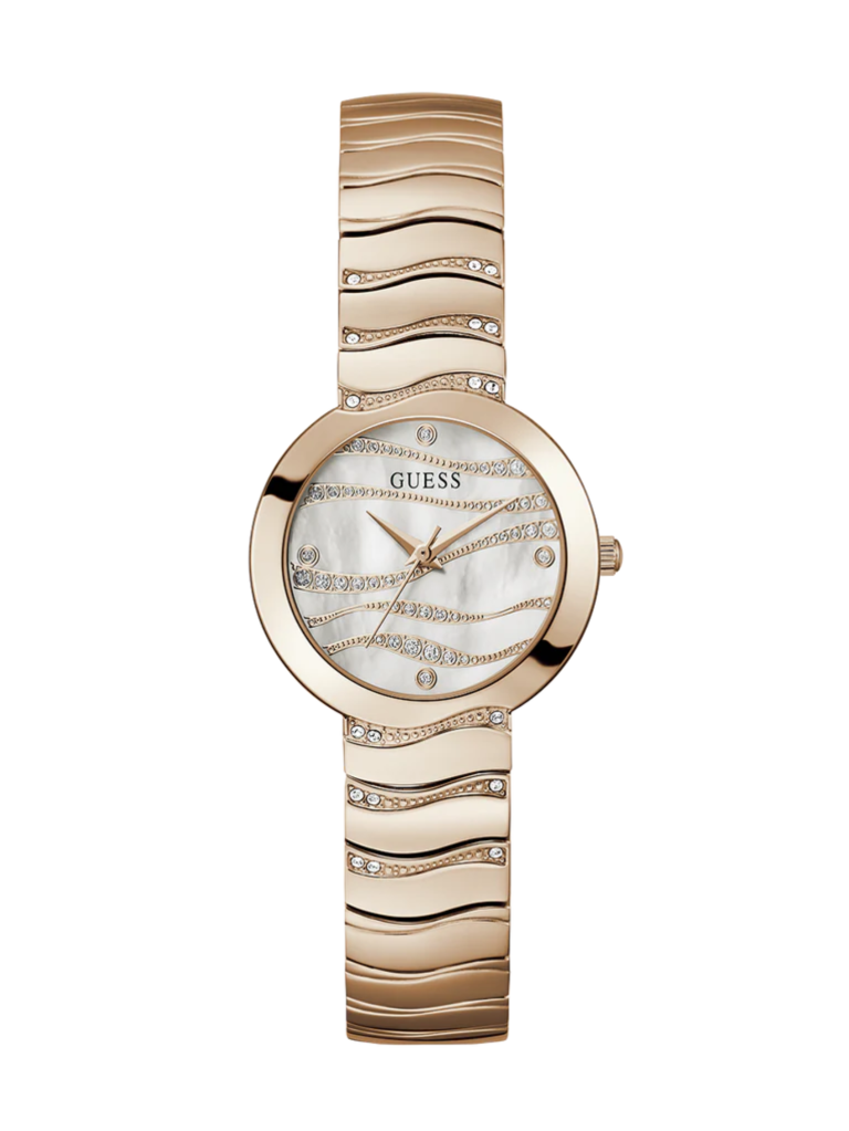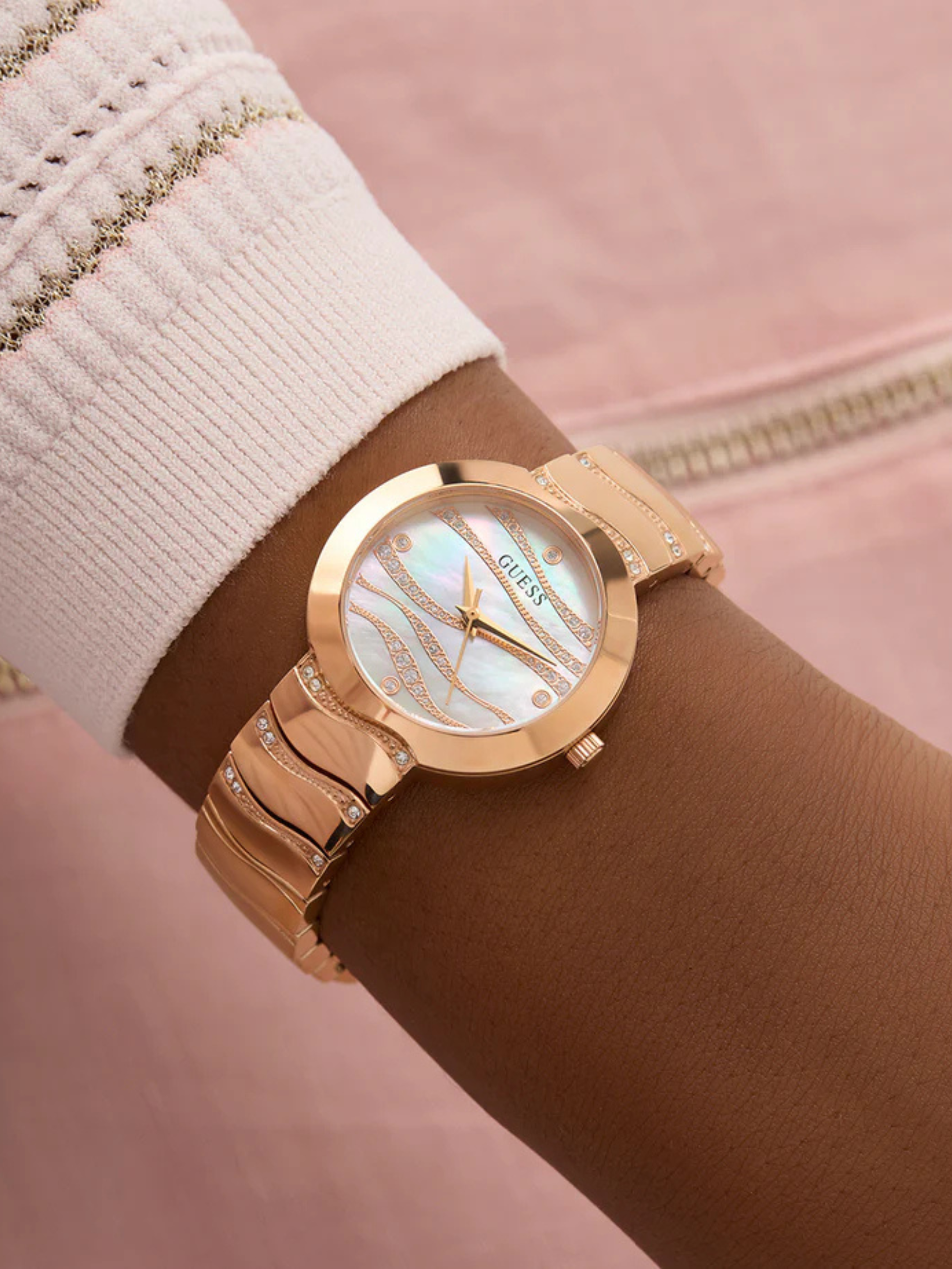 The perfect timepiece to make you feel like you’re on island time! This pretty new style features wave-like details on its bracelet and dial with MOP and glitz detailing.
