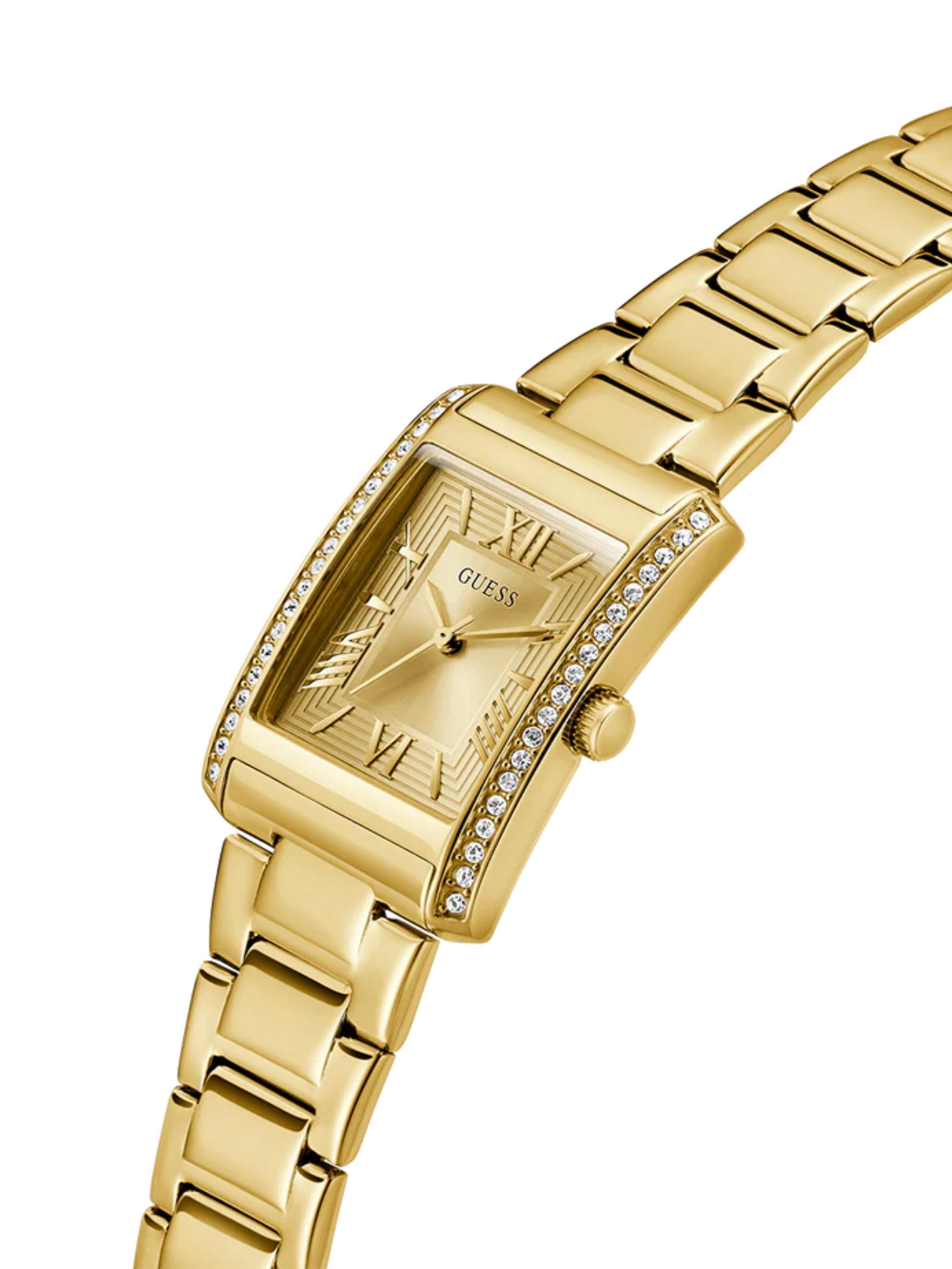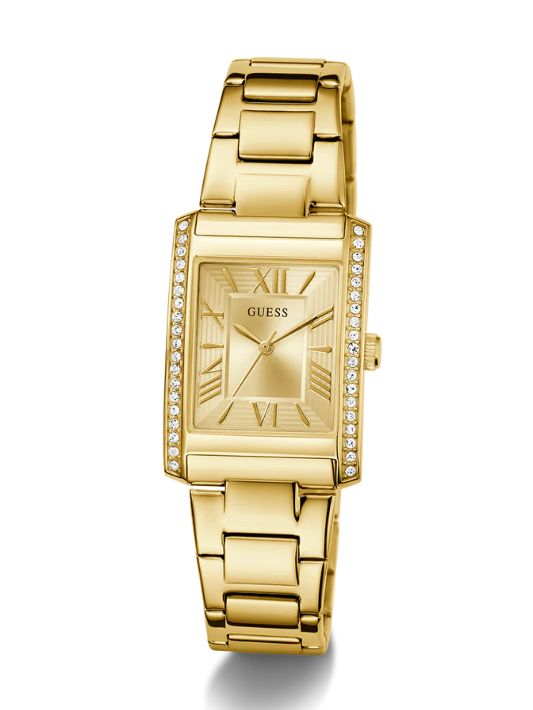 Add a touch of classic styling to your watch wardrobe with this new tank style featuring roman numeral indices, a stoned bezel and an elegant polished bracelet