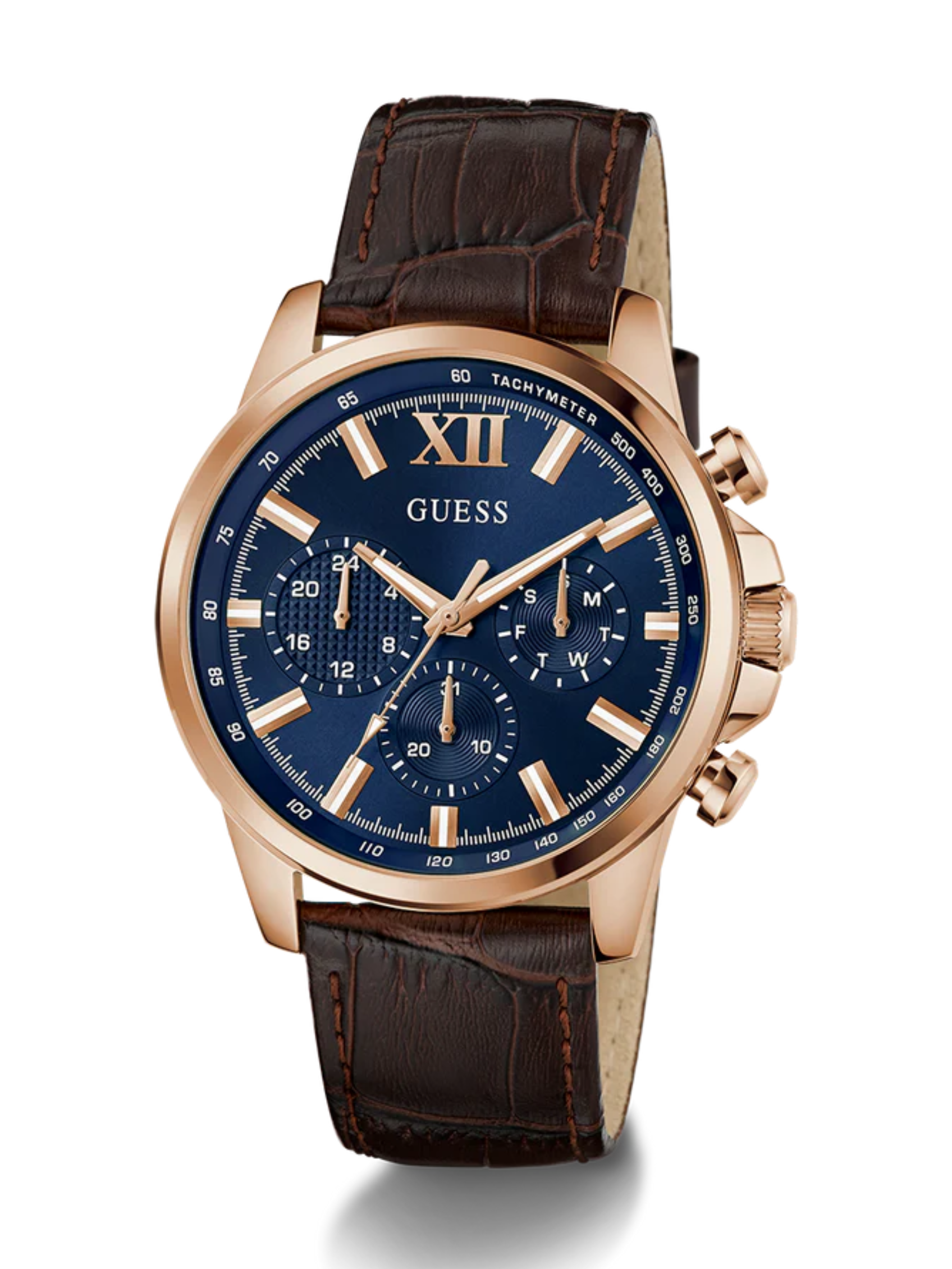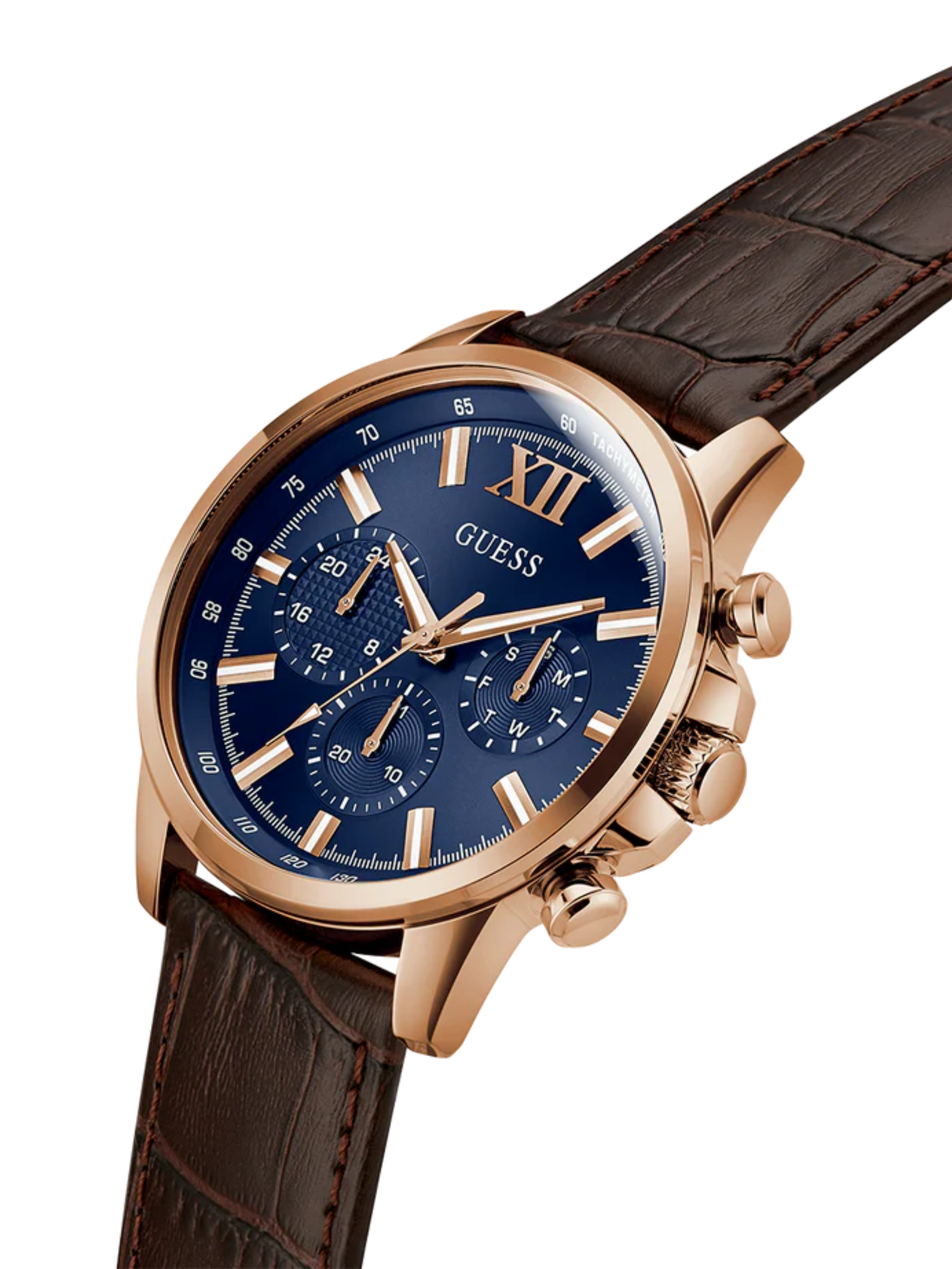 Sure to be a staple in your watch wardrobe this clean dress look features a chrono-look multi-function dial and is paired with a croco leather strap.