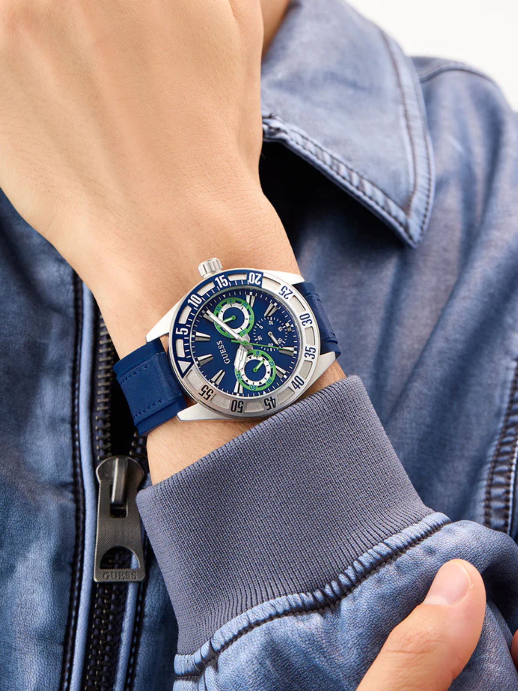 GUESS Mens Blue Silver Tone Multi-function Watch